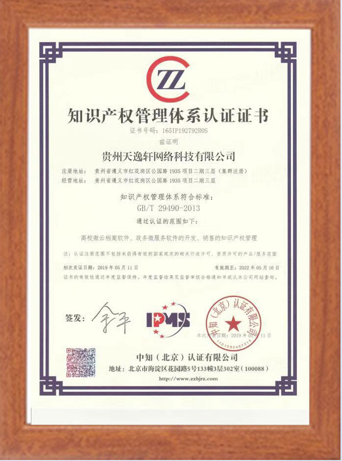 創新發展結碩果,天逸軒獲評知(zhī)≈→識産權管理(lǐ)體(tǐ)系認證, Ω± 公司知(zhī)識産權管理(₩™±lǐ)工(gōng)作(zuò)規範化(₩→π®huà)、系統化(huà)、科(kē)學化(huà)管理(lǐ↓♠ )。